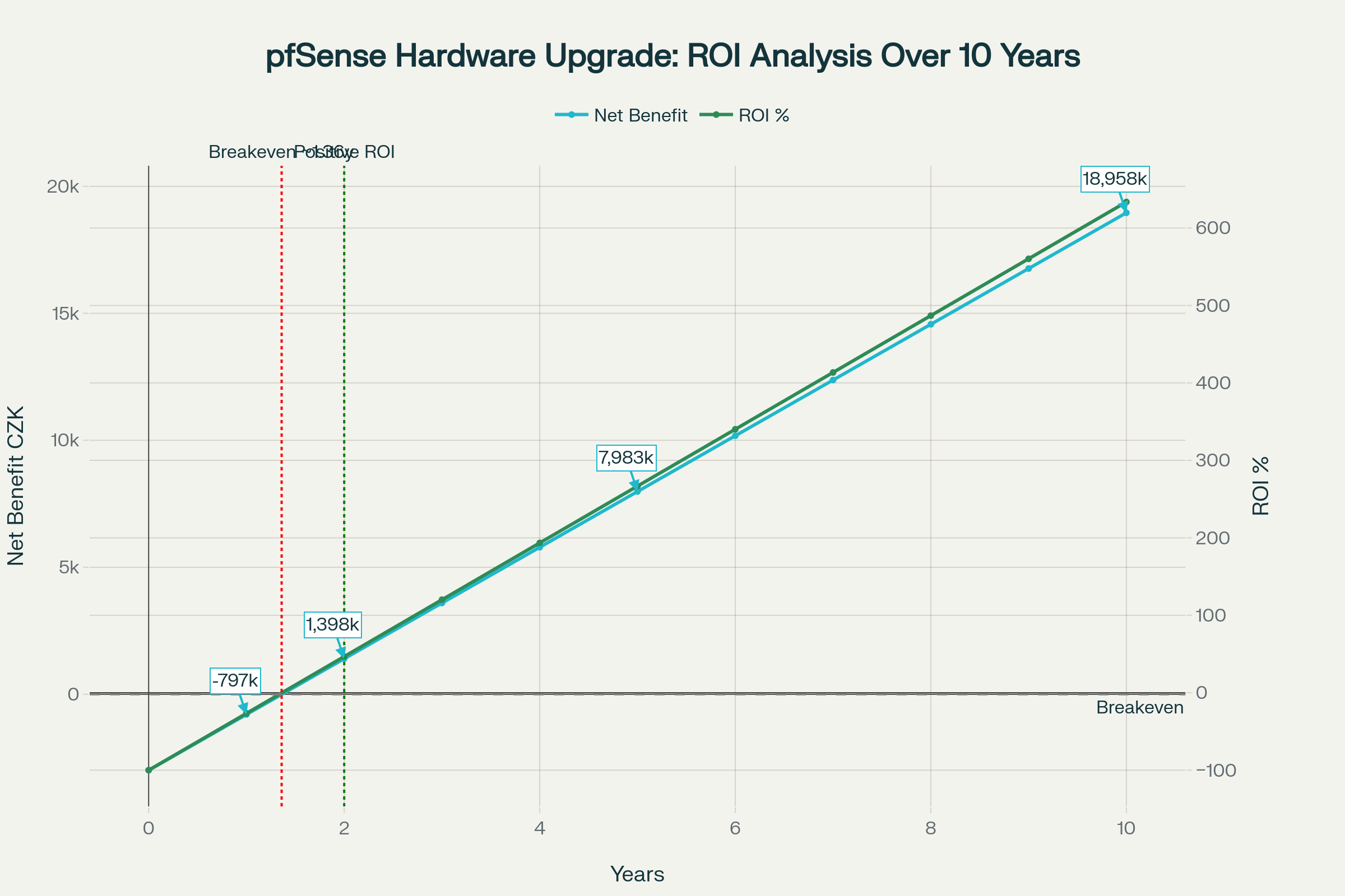 Klíčové bylo správné nastavení časového horizontu na 10+ let, což odpovídá reálné životnosti síťového hardware a umožňuje plné zužitkování investice v daných podmínkách SOHO použití (Small Office/Home Office – malá nebo domácí kancelář).^19